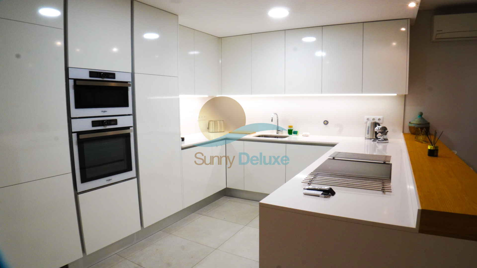 Placa de indução, exaustor no teto, com controlo remoto, forno elétrico, micro- ondas, máquina de lavar loiça, máquina de lavar roupa, frigorífico combinado,